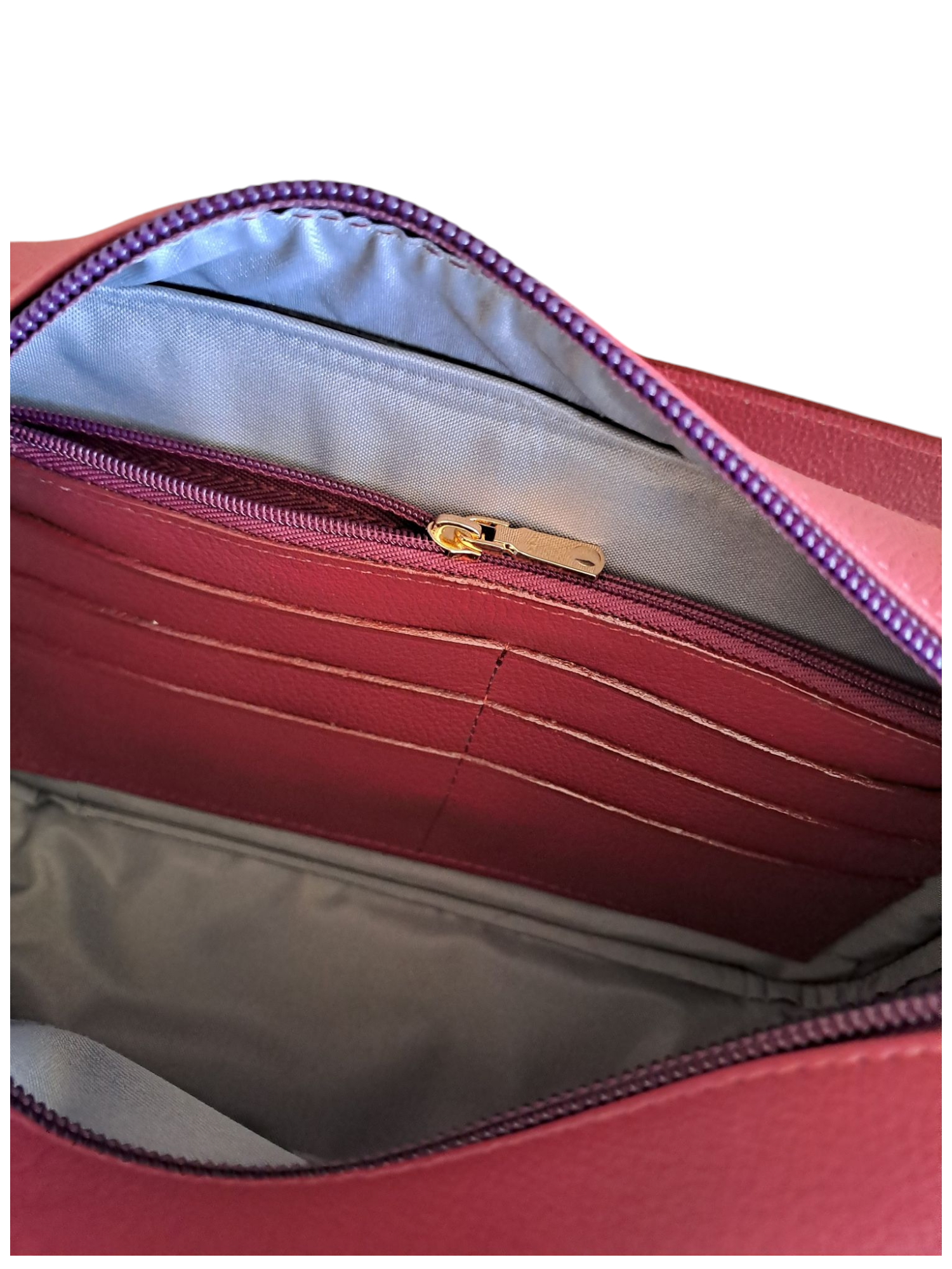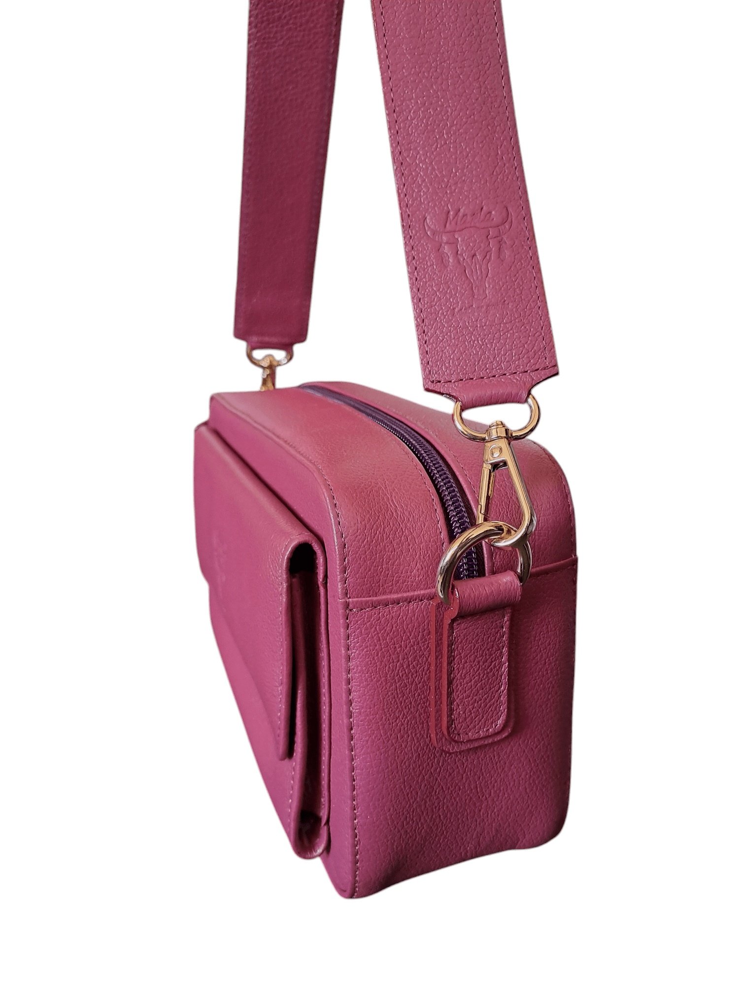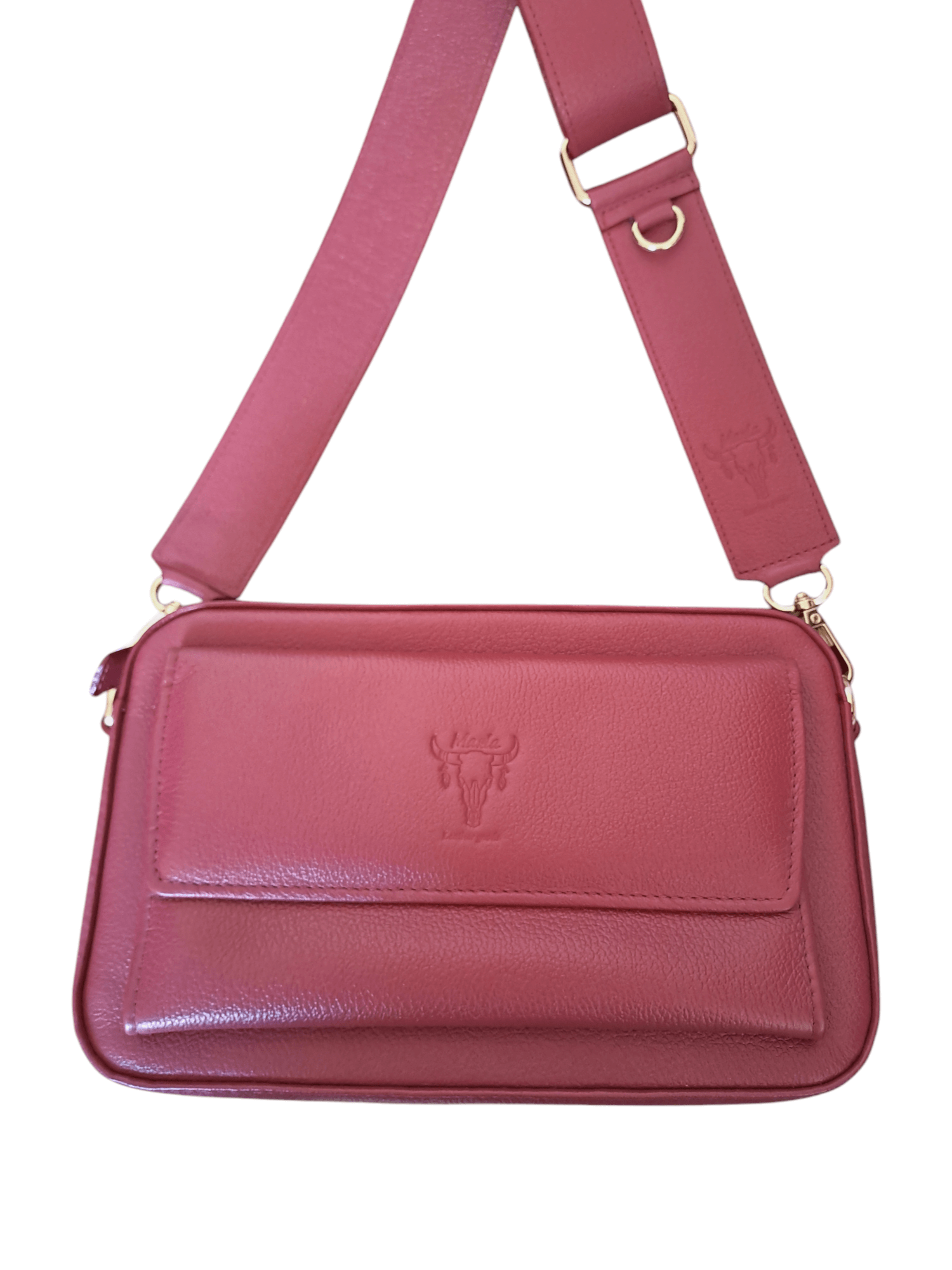 Bolso espacioso con bolsillo externo. Interior con bolsillo interno y 6 prácticos compartimentos tarjeteros. Cargadera en cuero graduable