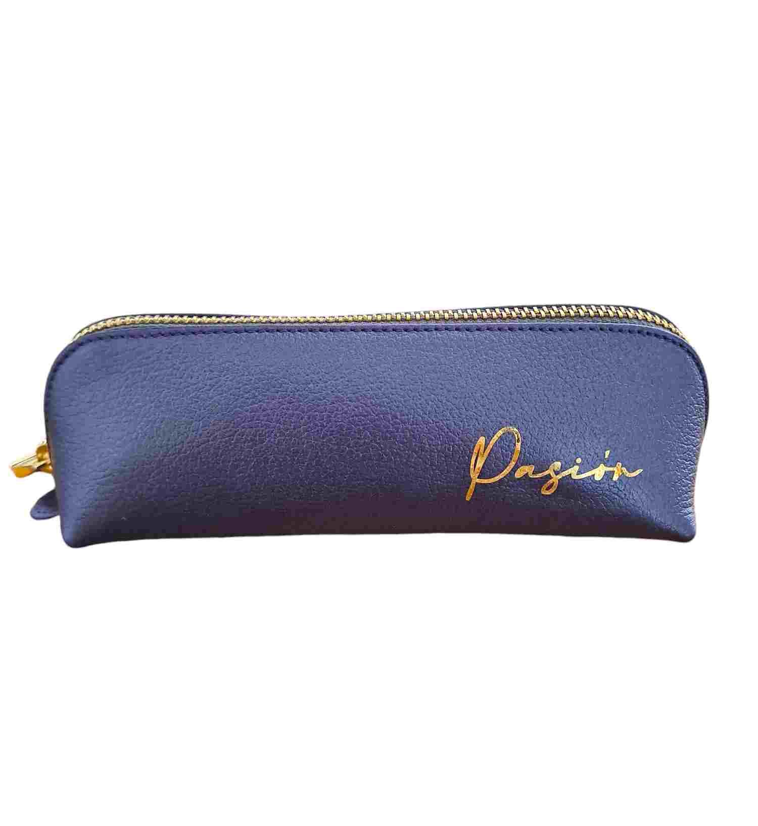 Portalapiz realizado en cuero con frase inspiracional realizado en vinil dorado.