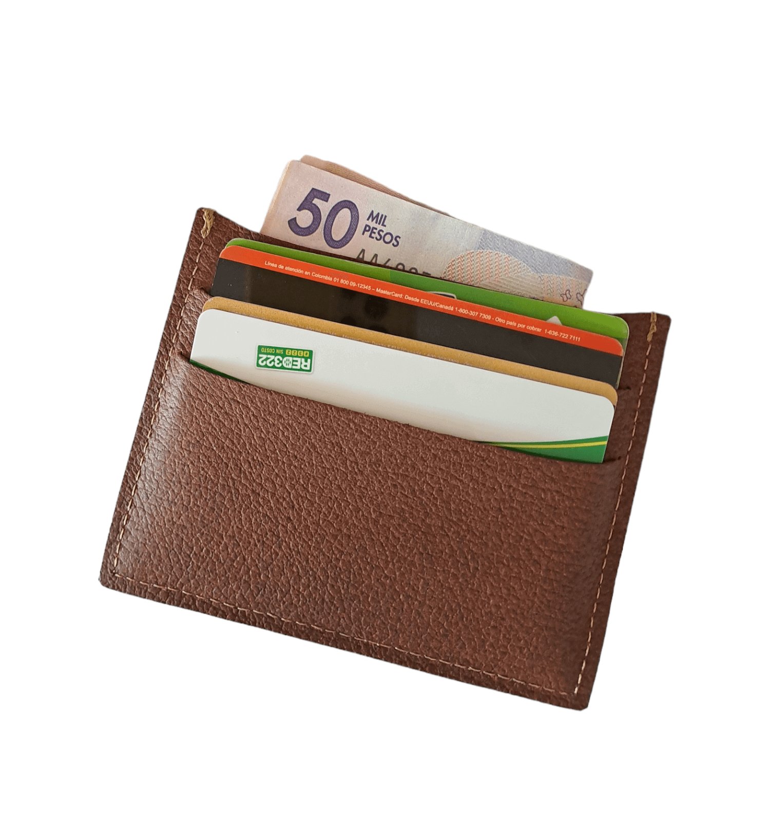 Tarjetero realizado en cuero con 5 bolsillos y capacidad para aproximadamente 10 tarjetas y billetes